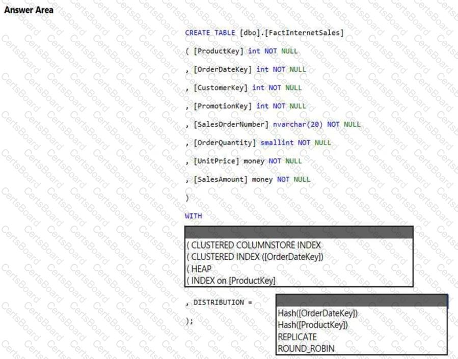 You need to create a table named FactInternetSales that will be a large fact table in a dimensional model. FactInternetSales will contain 100 million rows and two columns named SalesAmount and OrderQuantity. Queries executed on FactInternetSales will aggregate the values in SalesAmount and OrderQuantity from the last year for a specific product. The solution must minimize the data size and query execution time.