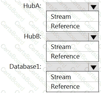 You have an Azure SQL database named Database1 and two Azure event hubs named HubA and HubB. The data consumed from each source is shown in the following table.