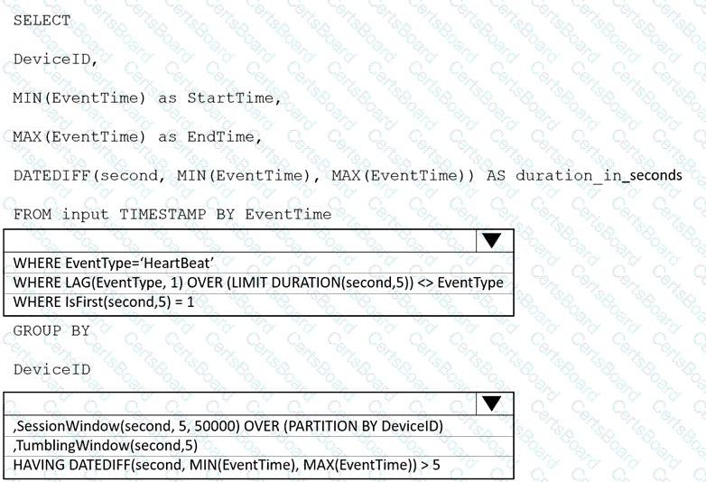 How should you complete the Stream Analytics SQL query? To answer, select the appropriate options in the answer area.