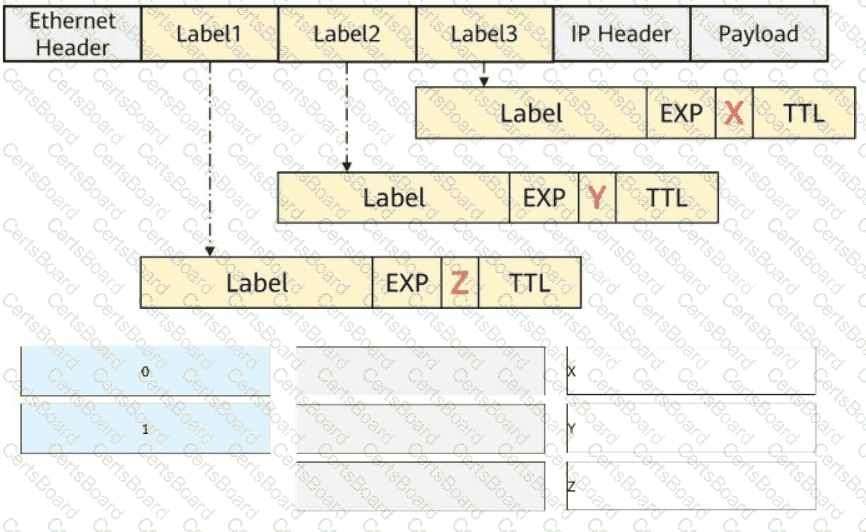 The figure shows a packet that contains three label headers. Select the values (in decimal notation) of the X, Y, and Z fields, respectively.