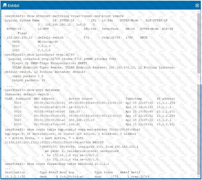 Referring to the exhibit, Host1 (10.1.1.1) is failing to communicate with Host2 (10.1.2.1) in a data center that uses an ERB architecture. What do you determine from the output?