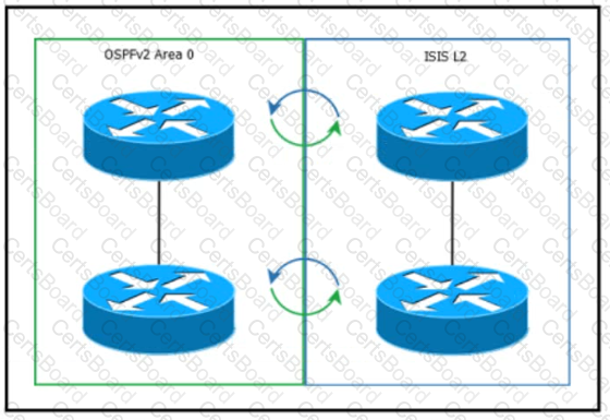Refer to the exhibit. An architect is designing a network that requires route redistribution. The design must prevent route feedback and the creation of routing loops. The OSPF domain is using default metrics, and the IS-IS domain is using narrow metrics. Which solution must the architect select?