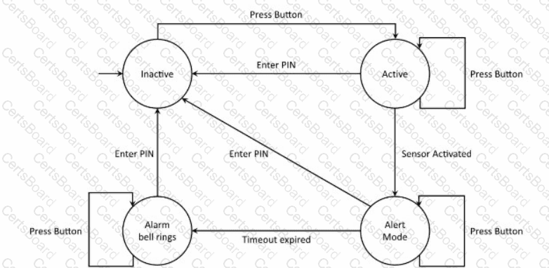 An anti-intrusion system is battery powered and is activated by pressing the only available button. To deactivate the system, the operator must enter a PIN code. The system will stay in alert mode within a configurable timeout and an alarm bell will ring if the system is not deactivated before the timeout expires. The following state transition diagram describes the behavior of the system: