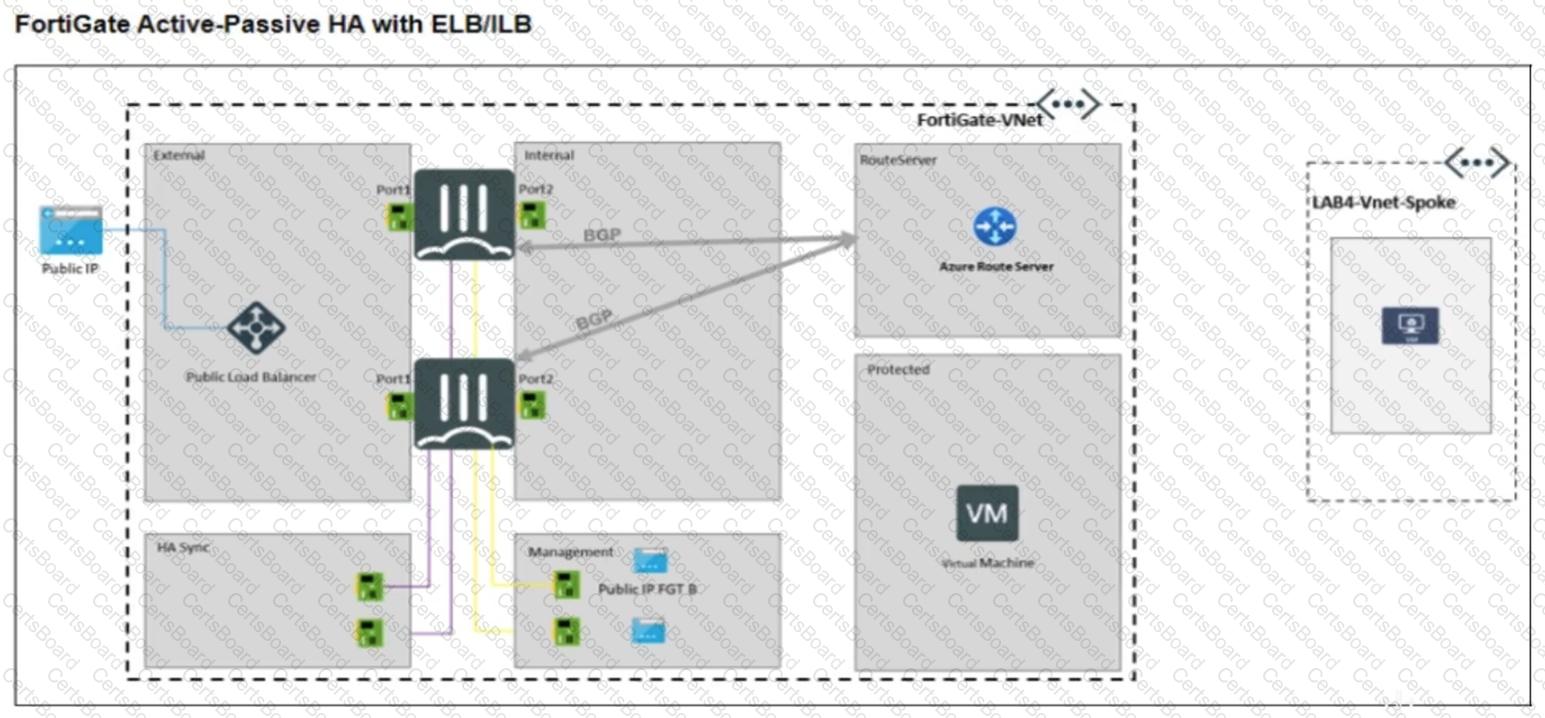 An Azure Route Server and an active-passive FortiGate with Elastic Load Balancing (ELB) and Internal Load Balancing (ILB) have been deployed successfully and they are sharing and populating BGP routes in the Protected VNet.