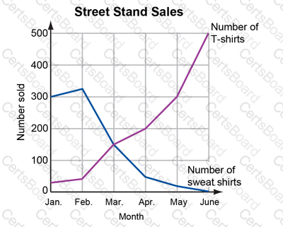 The numbers of sweat shirts and T-shirts sold at a street stand during the first six months of the year are shown in the graph at the left.