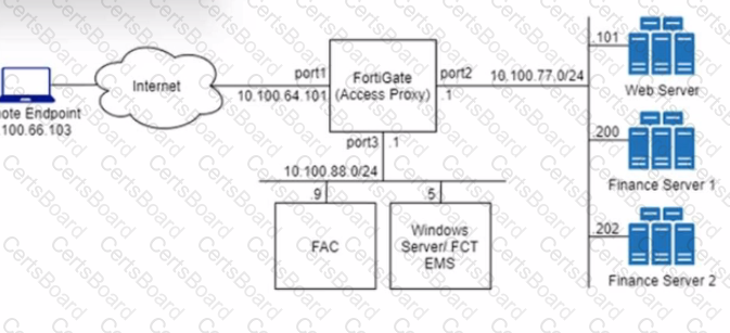 An HTTPS access proxy is configured to demonstrate its function as a reverse proxy on behalf of the web server it is protecting. It verifies user identity, device identity, and trust context, before granting access to the protected source. It is assumed that the FortiGate EMS fabric connector has already been successfully connected.